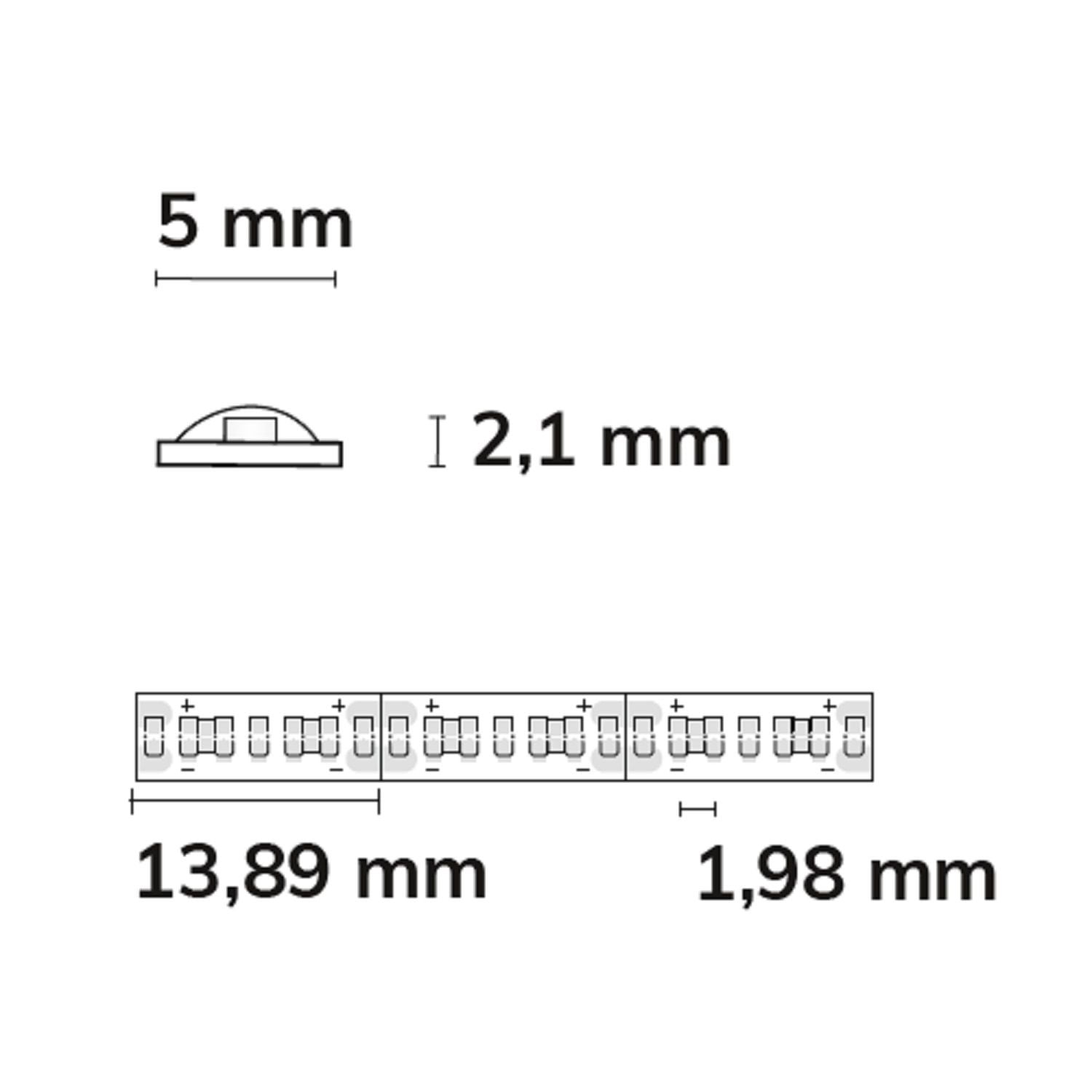Točka razdvajanja: 13,89 mm sa 7 SMD svaki | Razmak (svjetlosna točka centar-centar): 1,98 mm | 1 jedinica (rola) = 5m | max. duljina savitljive trake po uvlačenju: 5m | tolerancija duljine + toplinsko rastezanje: 1% | potrebna rashladna masa min. 45 gr/m | uklj. 3M 300LSE ljepljiva traka | Očistite i odmastite površinu prije nanošenja! Nemojte ponovno uklanjati! | Priključci grupe odgovaraju: K2-25 | Posebnost: priključni kabel jednostrani