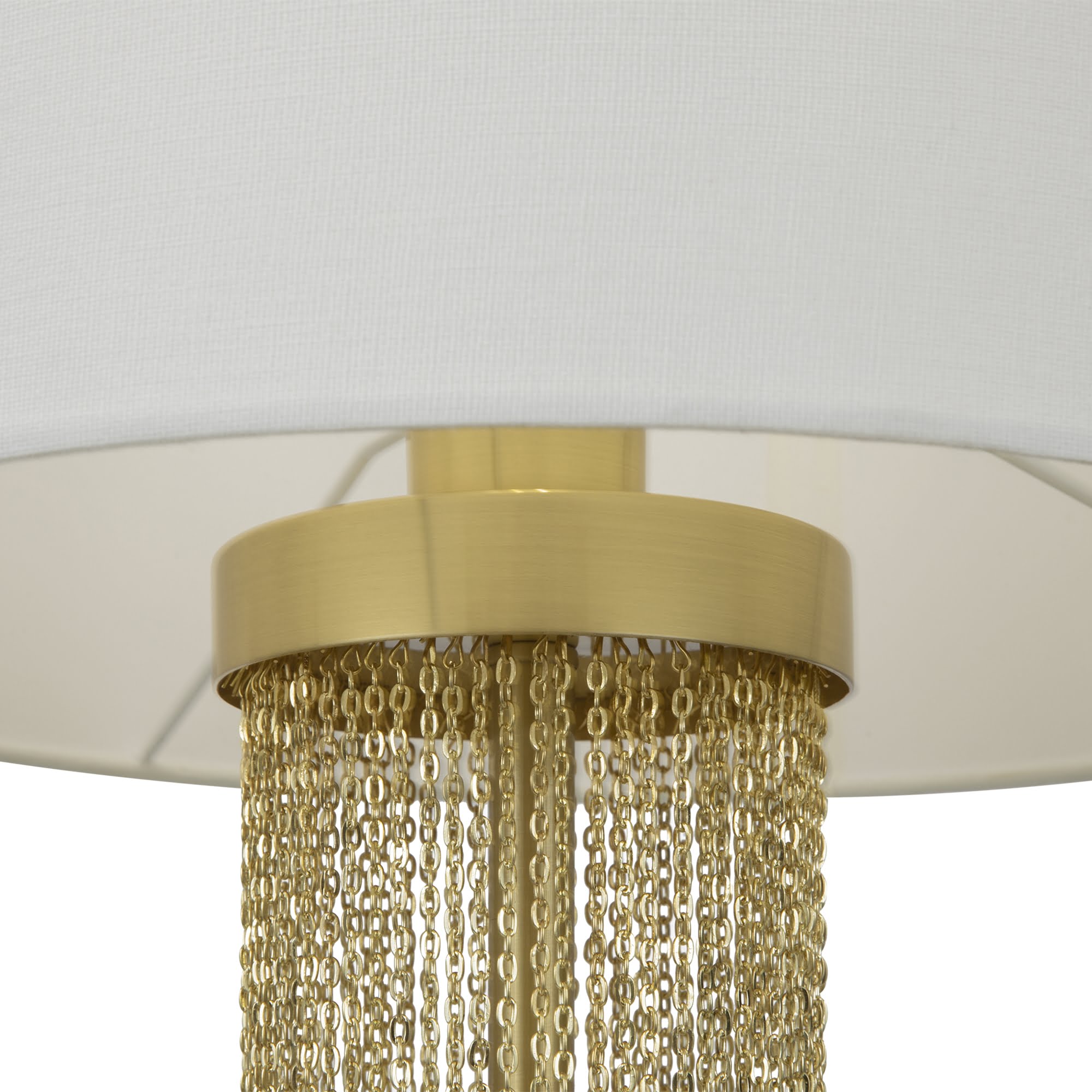 OPIS: Kućište od nehrđajućeg čelika. Boja – zlatna. Sjenilo — bijela tkanina. Ukrasni lančići iste su boje kao i Kućište. Odvojivi raspršivač od tkanine omekšava svjetlosni tok. Izvor svjetlosti — svjetiljke s bazom E14.